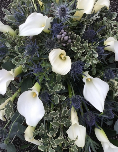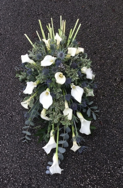 Calla Lily Single Ended Spray £0.00 Options 2 foot £80.00 2.5 foot £100.00 3 foot (as shown in picture) £120.00 3.5 foot £140.00 4 foot £160.00 Add to Basket SKU: SE30 This single ended spray contains calla lilies, eryngium and brunia with variegated foliage and stems, measuring approximately 36 inches (90 cm) in length. Message: