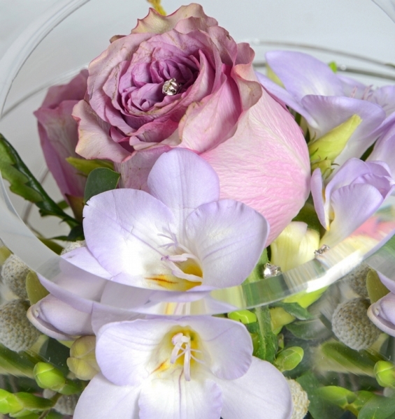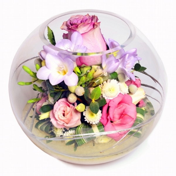 This beautiful design contains premium roses, freesia and lisianthus with coordinating foliage and stones. The clear glass bowl is approximately 15 cm high and is included in the price.