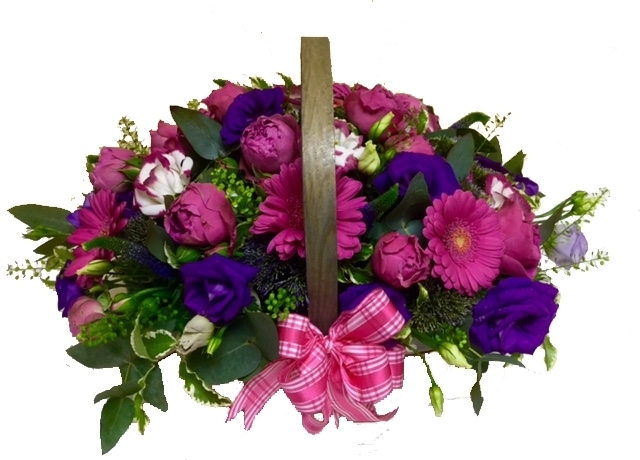 Basket of Joy Arrangement £45.00 Add to Basket SKU: BOJA001 A superb arrangement containing premium roses, germini, lisianthus and million bells with mixed foliage in a trug style basket completed with colour coordinated bows. Message: Alternative Products In the Pink Hat Box Arranagement £40.00 Buy Info