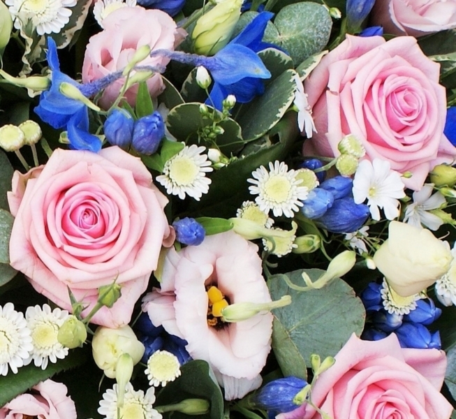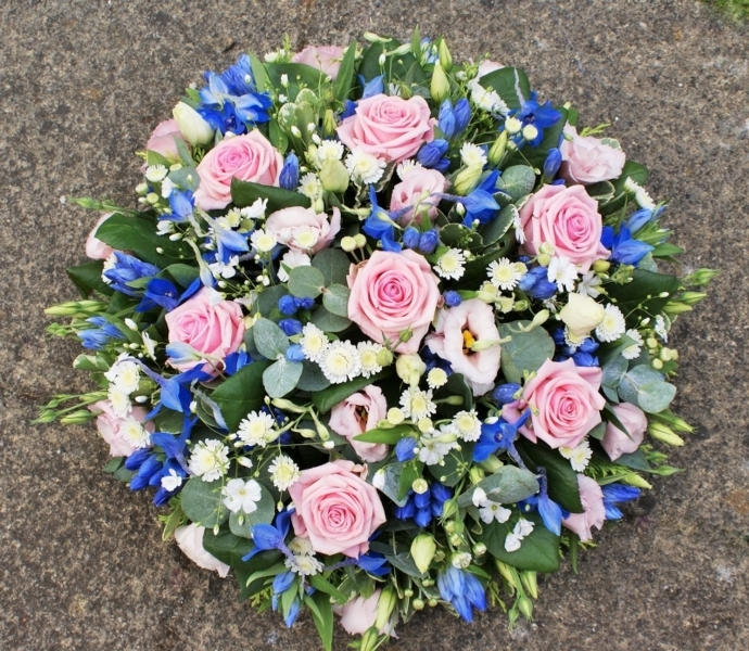 Blue and Pink Posy Pad £75.00 Add to Basket SKU: P11 A wonderful posy pad containing premium roses, gentiana, delphinium, lisianthus, stallion chrysanthemums and gypsophila with mixed foliage, measuring 15 inches (37 cm) in diameter. Message: