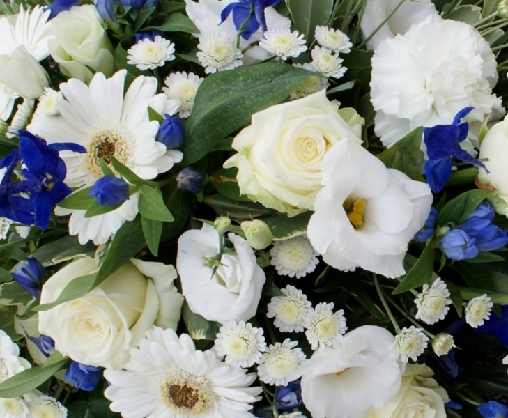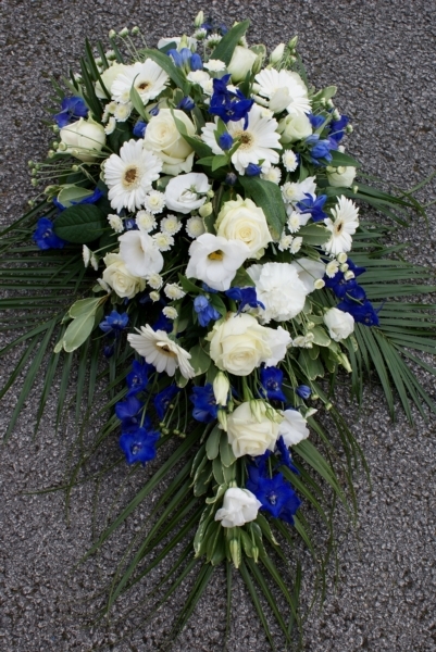 Blue and White Single Ended Spray £0.00 Options 2 foot £60.00 2.5 foot (as shown in picture) £75.00 3 foot £90.00 3.5 foot £105.00 4 foot £120.00 Add to Basket SKU: SE26 A beautiful single ended spray containing premium roses, delphiniums, germini, lisianthus and stallion spray chrysanthemums with coordinating foliage, measuring approximately 30 inches (75 cm) in length. Message: