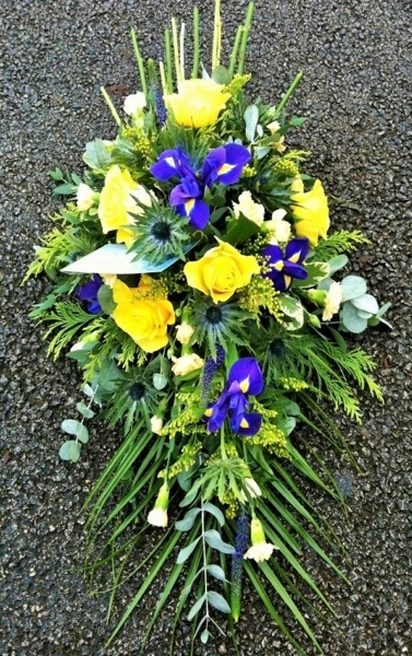 Blue and Yellow Single Ended Spray £0.00 Options 2 foot (as shown in picture) £60.00 2.5 foot £75.00 3 foot £90.00 3.5 foot £105.00 4 foot £120.00 Add to Basket SKU: SE31 This classic single ended spray with stems contains premium roses, iris, eryngium, solidago, spray carnations and veronica with coordinating foliage, measuring approximately 24 inches (60 cm) in length. Message: