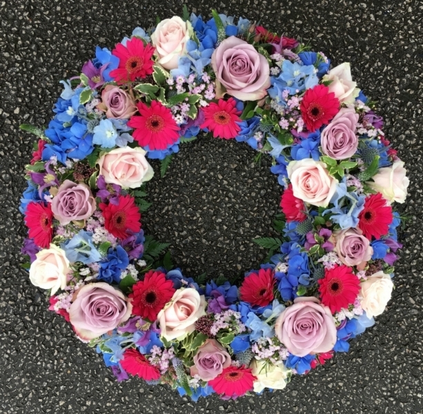 Blue, Pink and Mauve Wreath £0.00 Options 12 inch £115.00 14 inch (as shown in picture) £130.00 Add to Basket SKU: W41 This beautiful wreath contains premium roses, germini. delphinium, hydrangea, clematis, bouvardia and wax flower with coordinating foliage, measuring approximately 14 inches (35 cm) in diameter. Message: