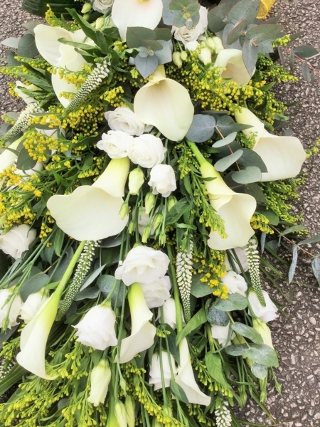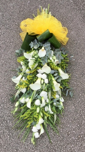 This stunning extra large sheaf contains calla lilies, lisianthus. veronica and solidago with mixed foliage of eucalyptus, aspidistra and phoenix palm, finished with a colour coordinated voile bow, measuring approximately 48 inches (120 cm) in length.