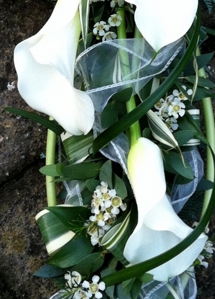 Calla Lily Cross £125.00 Add to Basket SKU: CR02 This striking cross contains calla lilies and wax flower with coordinating foliage, measuring approximately 24 inches (60 cm) in length. Message: