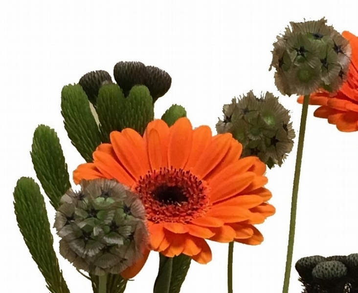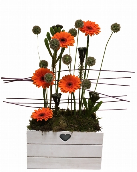 Looking for something modern and different? This stunning arrangement contains germini, scabious seed head and threaded hypericum berries or brunei, all set on a bed of moss in a wooden box (box and content may vary due to seasonal availability). If you would like this design in a different colour, please give your instructions in the optional information box in the Delivery Details section.