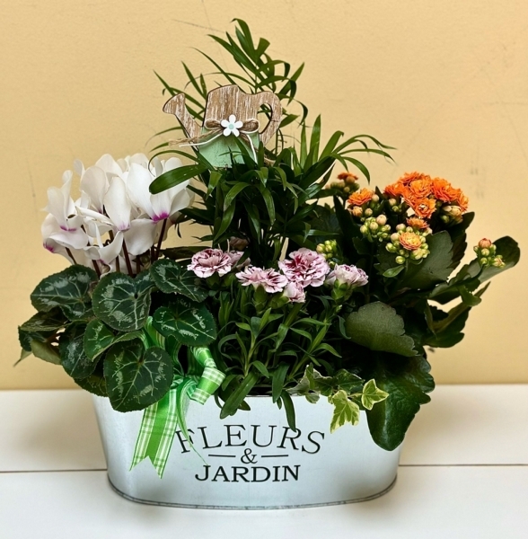 Especially For You Planted Arrangement £24.50 Add to Basket SKU: EFYPA001 This striking Fleurs & Jardin planter contains a variety of colourful indoor plants, for example cyclamen, peace lily, patio rose, kalanchoe, campanula or ivy. The planter design and colours may vary. Message: