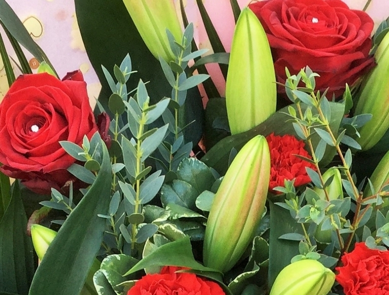 This stunning hand tied bouquet contains top quality red roses with diamante centres and oriental lilies, combined with red carnations and variegated foliage enhanced with a red feather heart. This amazing gift is presented on long stems, ready to be placed into your loved one's favourite vase; all completed with attractive wrapping and a striking voile ribbon bow.