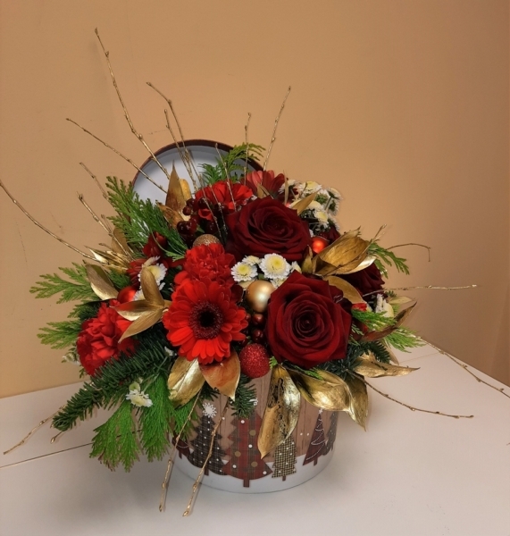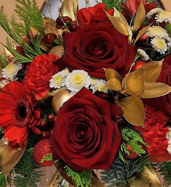 A glorious arrangement of premium red roses, carnation, germini, hypericum and stallion spray chrysanthemum with winter foliage enhanced with gold ruscus in a medium Christmas themed hat box (design of box may vary). If you would like this design in a different colour, please give your instructions in the optional information box in the Delivery Details section.