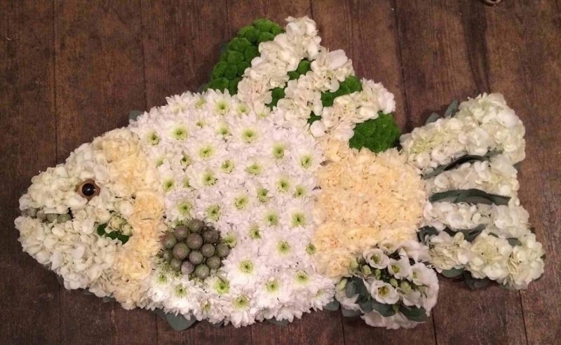 Fish £175.00 Add to Basket SKU: ID32 An unusual detailed tribute containing based chrysanthemums, carnation blooms, lisianthus, hydrangea, feeling green chrysanthemums and brunei with eucalyptus, Message:
