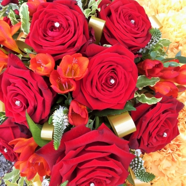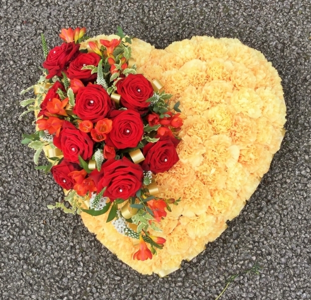 Golden Based Heart £0.00 Options 12 inch (as shown in picture) £125.00 15 inch £160.00 Add to Basket SKU: H83 This wonderful based heart contains a red Naomi rose, freesia and veronica spray with mixed foliage and based with carnation blooms, measuring approximately 12 inches (30 cm) in width. Message:
