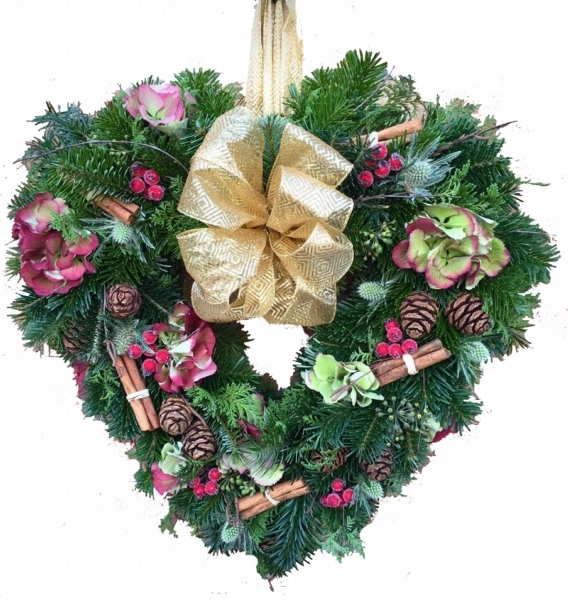 Golden Heart Door Wreath £47.50 Add to Basket SKU: GHDW001 We love this pretty door wreath, it contains hydrangea, eryngium, mini natural cones, cinnamon sticks and frosted berries with Christmas foliage ivy berries with a striking golden ribbon bow. (45" diameter) Message: