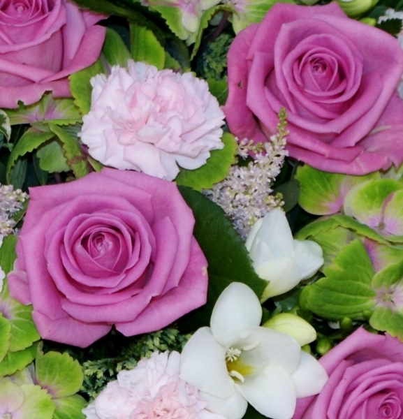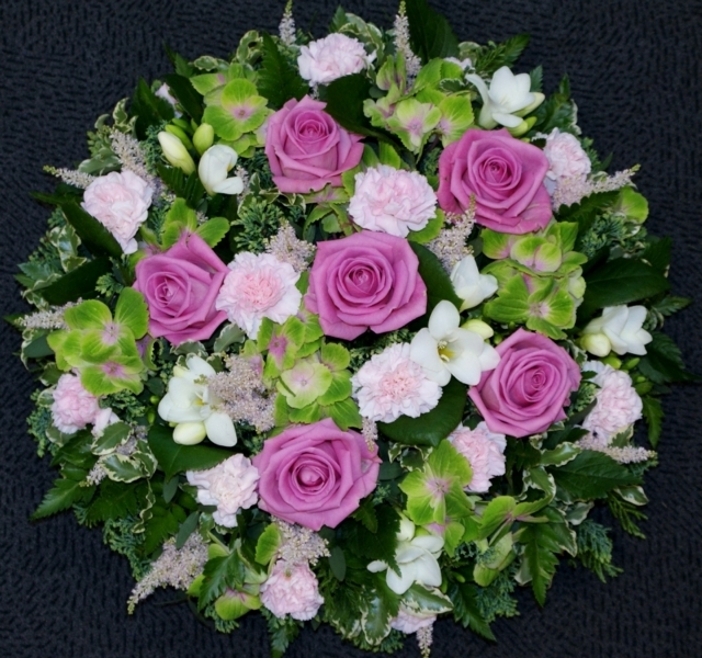 Green and Pink Posy Pad £85.00 Add to Basket SKU: P07 This attractive posy pad contains premium roses, hydrangea, freesia, spray carnations and astilbe with coordinating foliage, measuring 18 inches (45 cm) in diameter. Message: