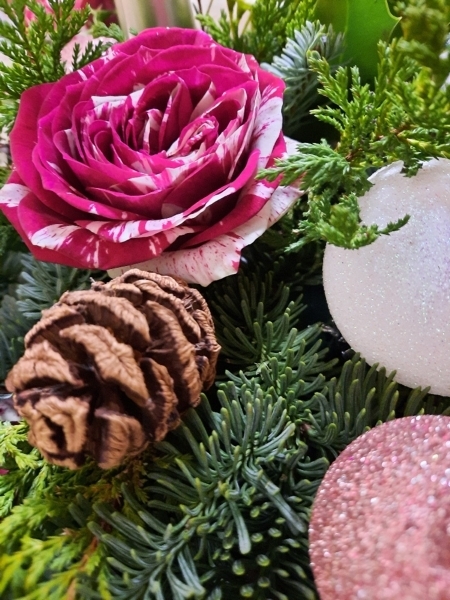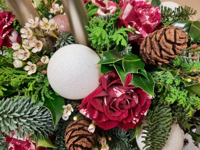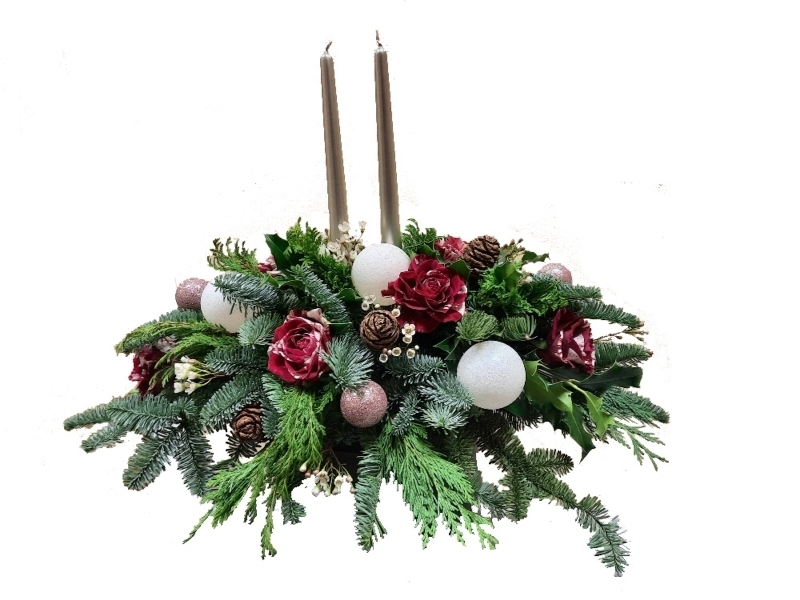 An amazing oval table arrangement showcasing Harlequin premium roses & wax flower with mini cones, large & small baubles with beautiful Christmas foliage enhanced with silver candles.