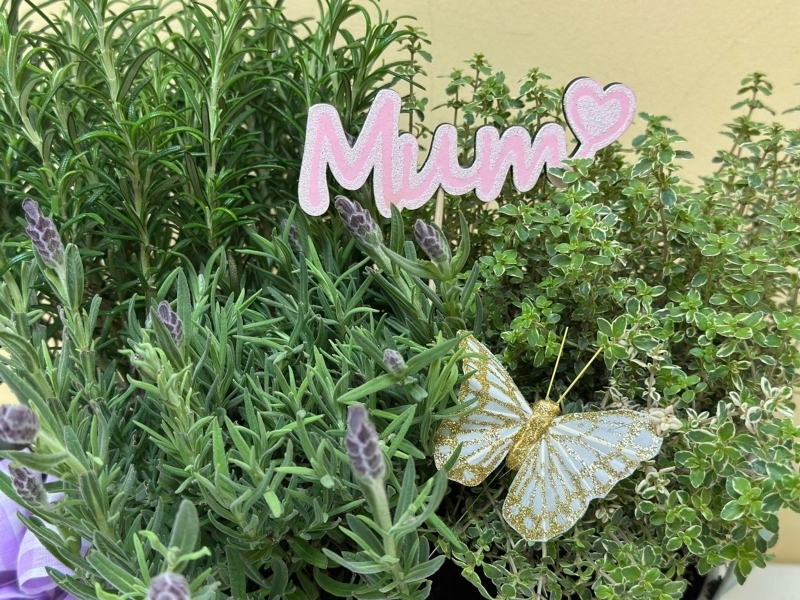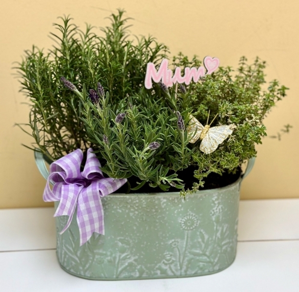 Herb Garden Arrangement £29.50 Add to Basket SKU: HGA001 Beautiful and useful, a striking embossed zinc container full of fragrant rosemary, thyme and lavender. The container/design may vary. Message: