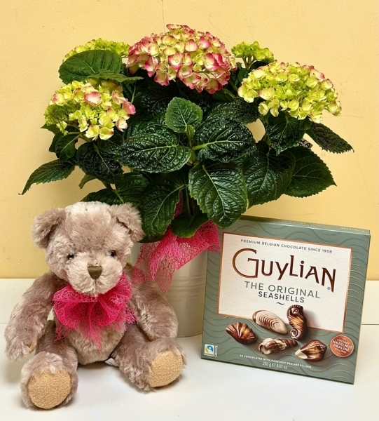 Hydrangea Gift Set Plant £35.00 Add to Basket SKU: HGSP001 A pretty potted hydrangea plant, together with the cutest teddy bear and delicious box of chocolates. (Flower colour may vary) Message: