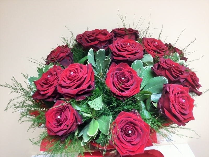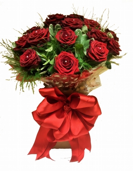 Premium quality velvet Explorer roses enhanced with diamante centres beautifully hand tied with pittosporum and tree fern. Presented in a tall aqua box finished with a satin finish ribbon and a wire sculptured heart. The ultimate gift for the one you love.