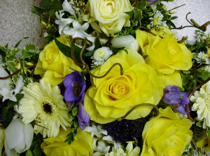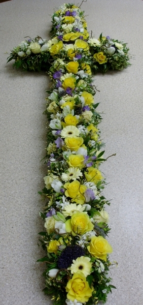 Lemon Cross £325.00 Add to Basket SKU: CR01 This amazing cross contains premium roses, germini, freesia, stallion chrysanthemums and tulips with mixed foliage, measuring approximately 60 inches (150 cm) in length. Message: