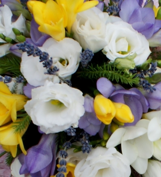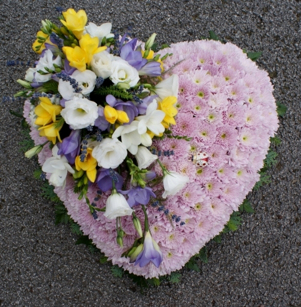 Lilac Based Heart £0.00 Options 12m inch (as shown in picture) £135.00 14 inch £170.00 Add to Basket SKU: H86 This enchanting based heart contains a freesia, lisianthus and lavender spray with mixed foliage and double basing chrysanthemums, measuring approximately 12 inches (30 cm) in width. Message: