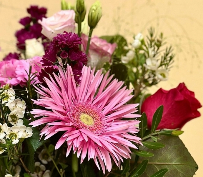 A beautiful contemporary arrangement containing stunning germini, roses, lisianthus, spray carnations, wax & September flower with coordinating foliage.in a pretty printed ceramic handled container ( (jug design & colour may vary).