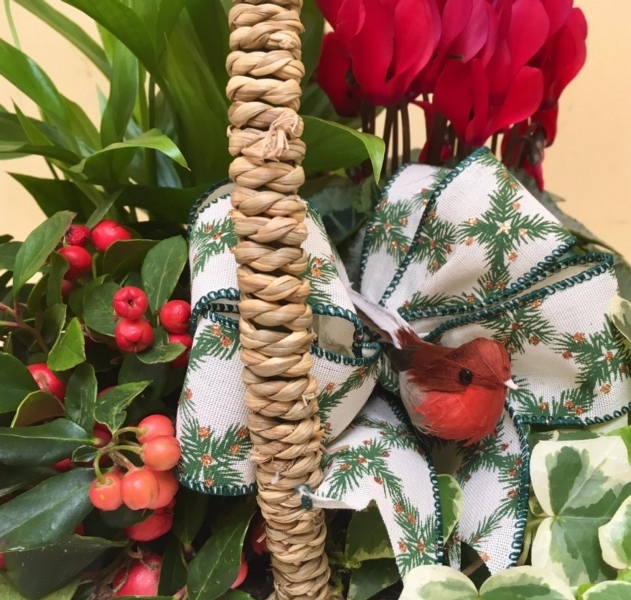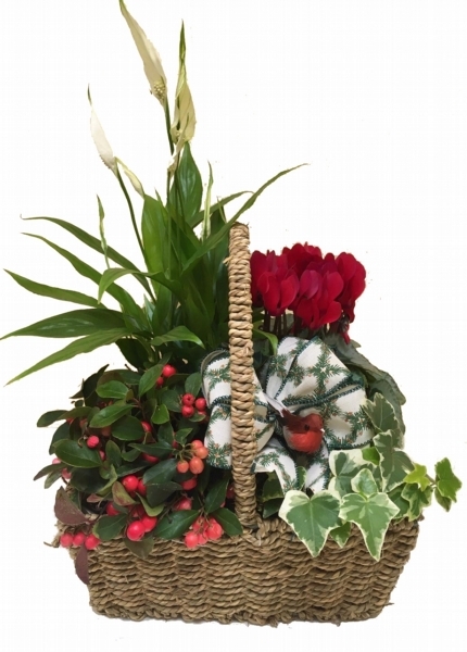 Merry Christmas Planted Basket £30.00 Add to Basket SKU: MCPB001 A beautiful Christmas woven basket containing Peace Lily, Cyclamen, Gaultheria Berry, Variegated Ivy, all finished with a Christmas bow & the cutest robin red breast. (Basket design & plant content may vary). Message: