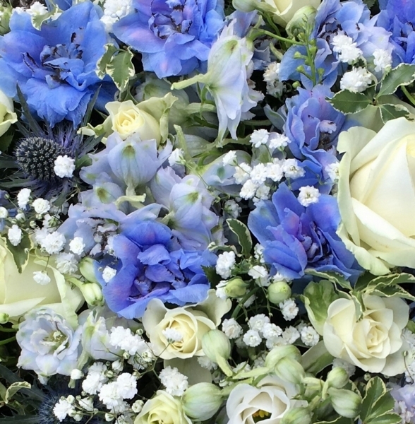 Mixed Blue Posy Pad £0.00 Options 12 inch (as shown in picture) £90.00 14 inch £105.00 Add to Basket SKU: P70 This beautiful posy pad contains delphinium, premium roses, spray roses, eryngium and gypsophila with coordinating foliage, measuring approximately 12 inches (30 cm) in diameter. Message: