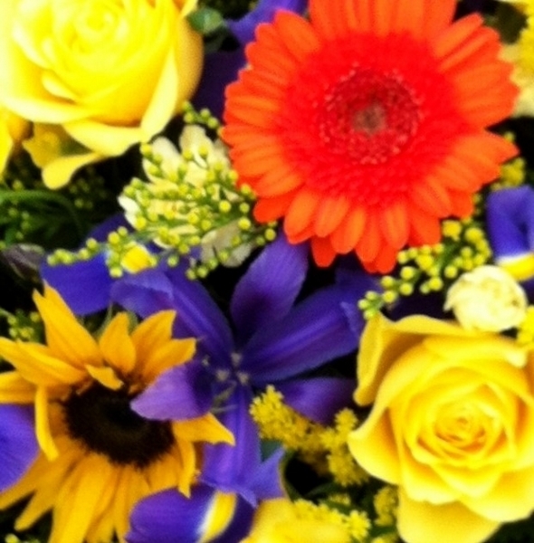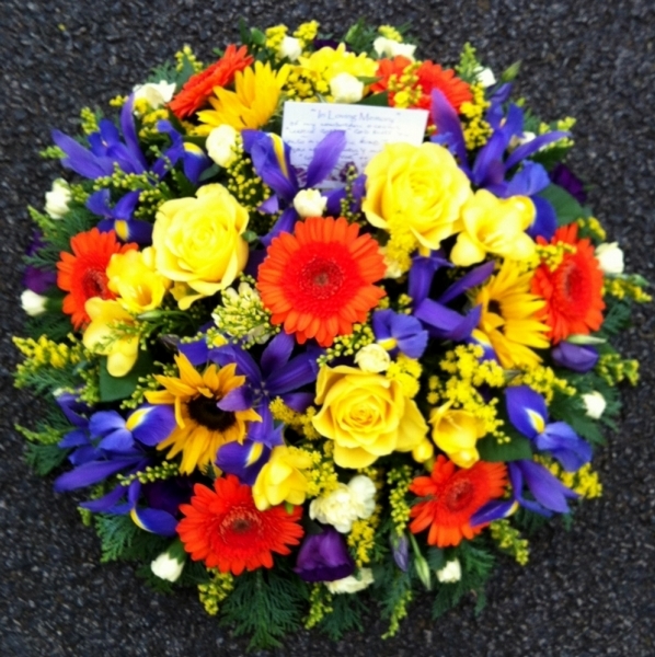 Mixed Posy Pad £85.00 Add to Basket SKU: P10 This striking posy pad contains quality roses, gerbera, iris, sunflower, solidago and lisianthus with coordinating foliage, measuring approximately 18 inches (45 cm) in diameter. Message: