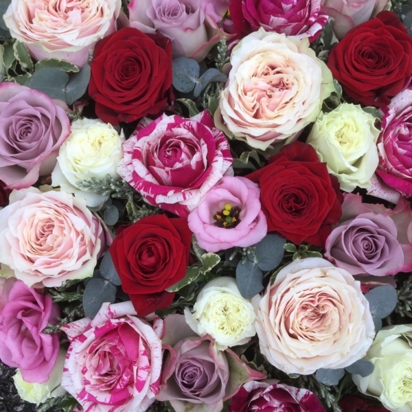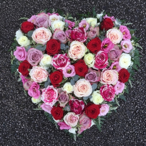Mixed Rose Heart £150.00 Add to Basket SKU: H04 An exquisite heart containing red, white, pink and lilac mixed quality roses with coordinating foliage, measuring approximately 15 inches (37 cm) in width. Message: