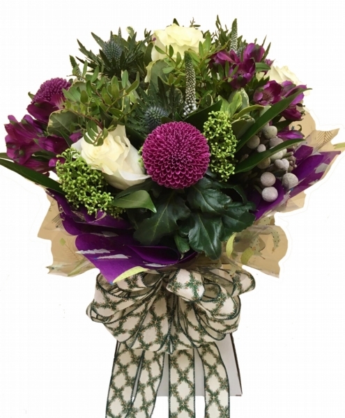 Mulled Wine Aqua Bouquet £50.00 Add to Basket SKU: MWAB001 This stunning bouquet contains premium roses, chrysanthemum blooms, eryngium. alstroemeria, brunia & veronica with skimmia & coordinating foliage, all completed with a beautiful festive bow. Message:
