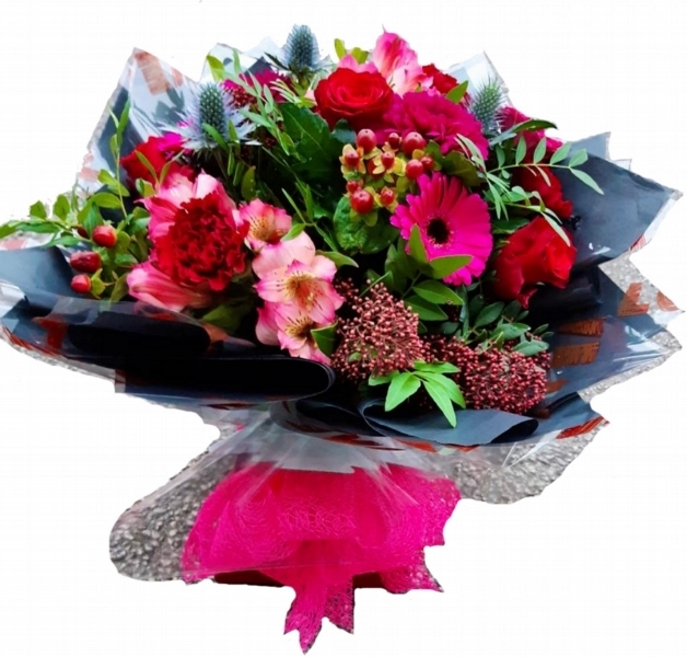 This beautiful hand tied design contains stunning quality red roses, hot pink germini, red carnations, pink alstroemeria, eryngium thistle, hypericum and skimmia with mixed foliage, beautifully presented in an aqua box finished with colour coordinated ribbon.