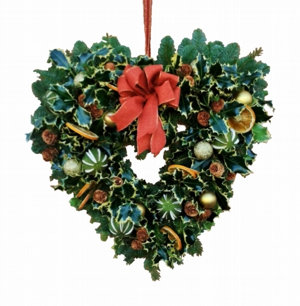 Woodland Open Heart Door Wreath £45.00 Add to Basket SKU: WOHDW01 This striking door wreath contains fresh winter foliage with dried fruits, cones and satin & glittering baubles completed with a beautiful citrus gold edged ribbon bow, measuring approximately 18 inches (45 cm) in length. Message: