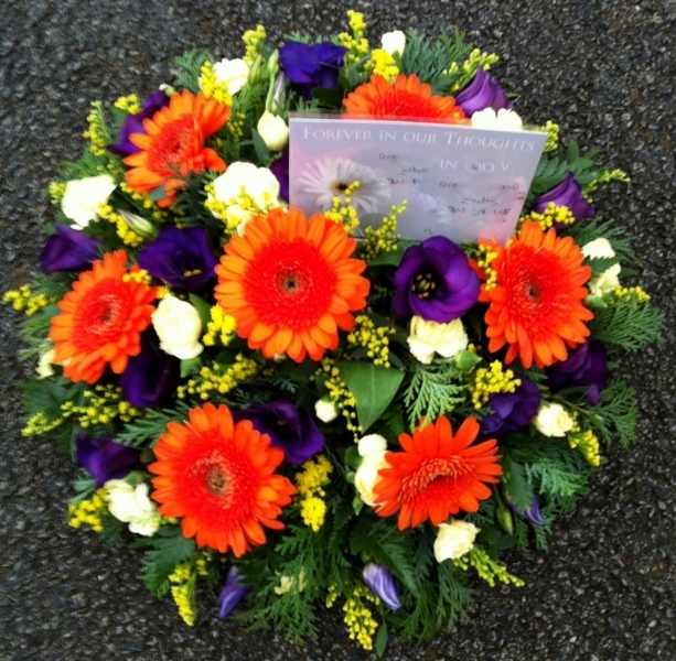 Orange and Purple Posy Dish £37.50 Add to Basket SKU: P08 This striking posy dish contains gerbera, lisianthus, solidago and spray carnations with coordinating foliage, measuring approximately 8 inches (20 cm) in diameter. Message: