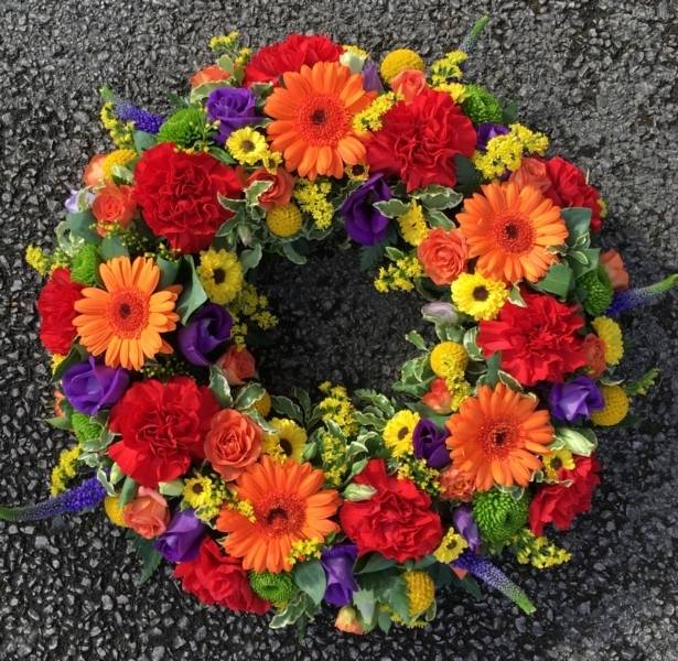 Orange and Purple Wreath £0.00 Options 12 inch (as shown in picture) £95.00 14 inch £110.00 Add to Basket SKU: W82 This striking wreath contains germini, craspedia, spray roses, carnations, spray chrysanthemums, solidago, veronica and lisianthus with mixed foliage, measuring approximately 12 inches (30 cm) in diameter. Message: