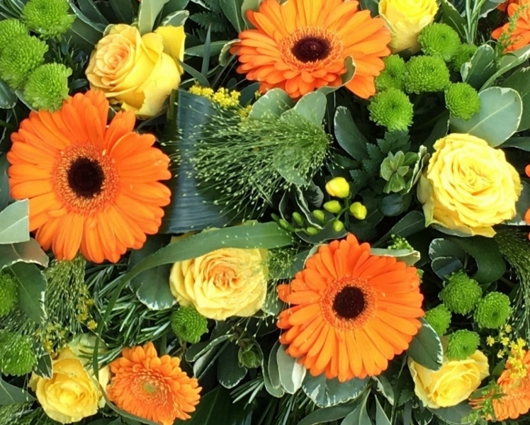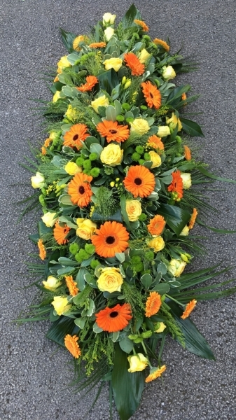 Orange Gerbera Double Ended Spray £0.00 Options 3 foot £140.00 4 foot (as shown in picture) £185.00 5 foot £235.00 6 foot £280.00 Add to Basket SKU: DE1 A wonderful double ended spray contains gerbera, premium roses, solidago,, spray chrysanthemum and panicum grass with beautiful foliage measuring approximately 48 inches (120 cm) in length. Message: