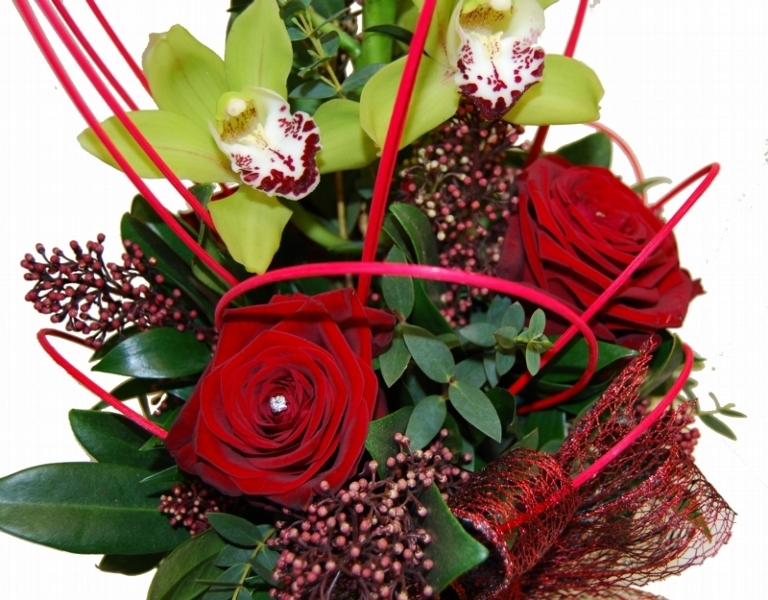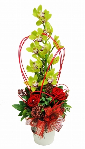 Oriental Love Arrangement £55.00 Add to Basket SKU: OLA01 This amazing arrangement contains premium red roses enhanced with diamante, cymbidium orchids and skimmia with mixed foliage in a coordinating ceramic container. Message: