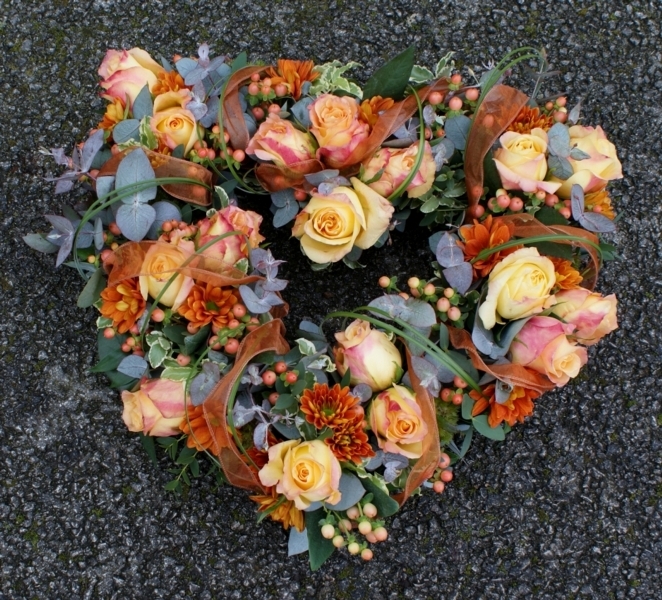 Peach and Orange Open Heart £115.00 Add to Basket SKU: H14 A wonderful open heart containing premium roses, hypericum and spray chrysanthemums with mixed foliage and voile ribbon, measuring approximately 15 inches (37 cm) in width. Message: