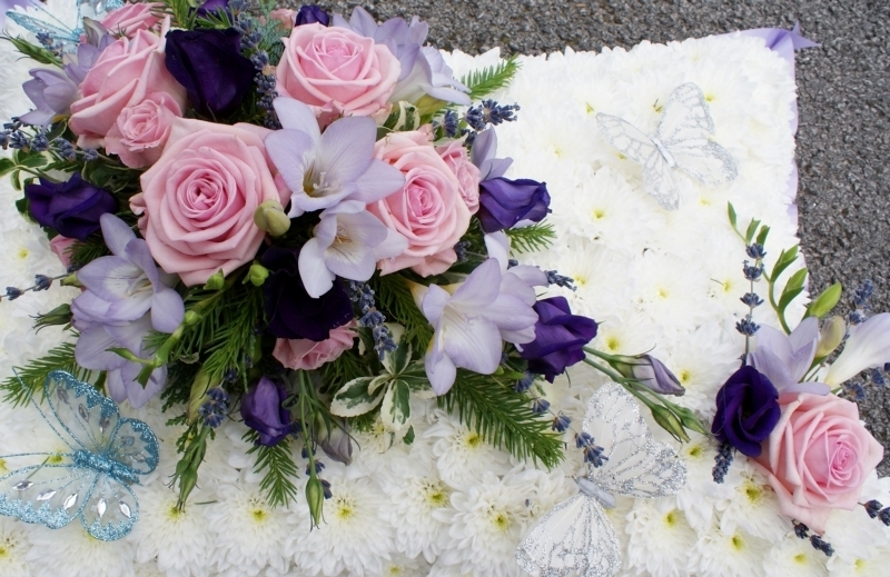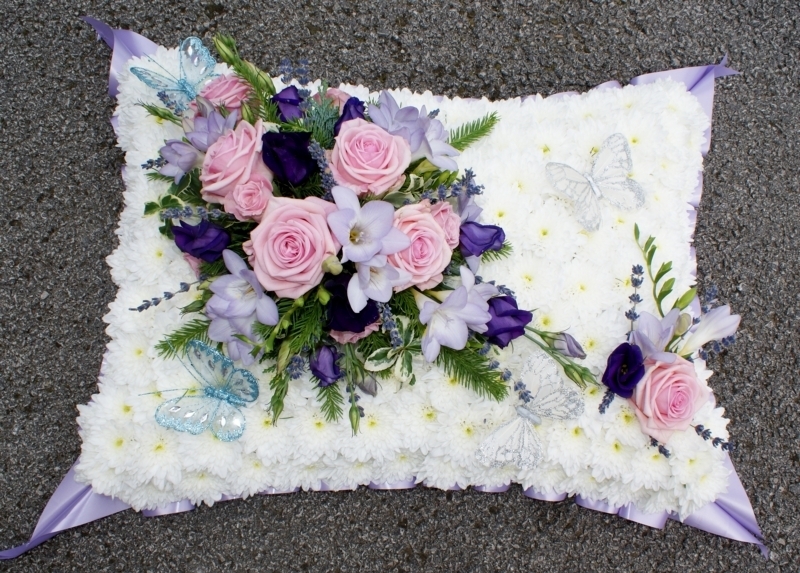 Pink and Lilac Butterfly Pillow £160.00 Add to Basket SKU: PI02 A delightful pillow containing premium roses, freesia, lisianthus and lavender with double basing chrysanthemums and mixed foliage, enhanced with beautiful butterflies; measuring approximately 18 inches (45 cm) in length. Message:
