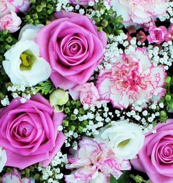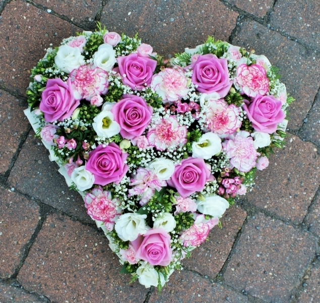 Pink and White Heart £125.00 Add to Basket SKU: H11 This delightful heart contains premium roses, bouvardia, carnations, lisianthus, spray carnations and gypsophila with mixed foliage, measuring approximately 15 inches (37 cm) in width. Message: