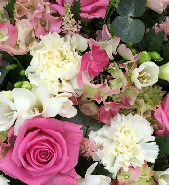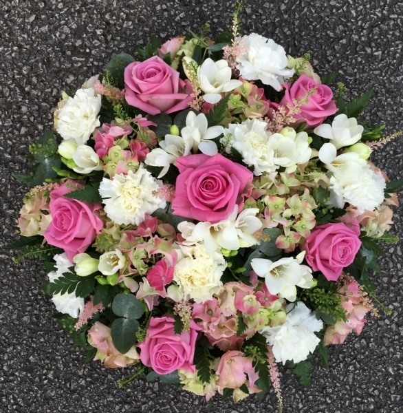 Pink and White Posy Pad £0.00 Options 12 inch (as shown in picture) £85.00 14 inch £100.00 Add to Basket SKU: P63 This pretty posy pad contains premium roses, hydrangea, carnation blooms, freesia and veronica with coordinating foliage, measuring 12 inches in diameter. Message: