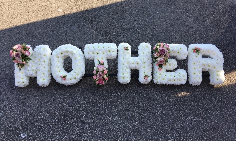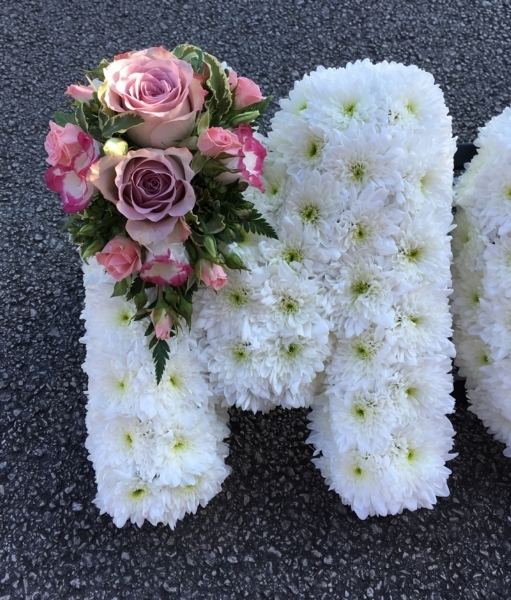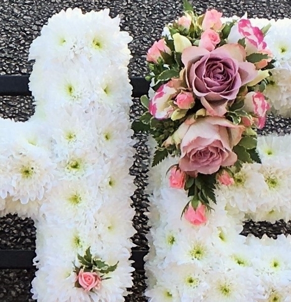 Individual tributes can be created using your choice of letters, this is based using white double chrysanthemums, edged with pink ribbon and highlighted with beautiful pink and white sprays using quality roses, spray roses and lisianthus with variegated foliage.
