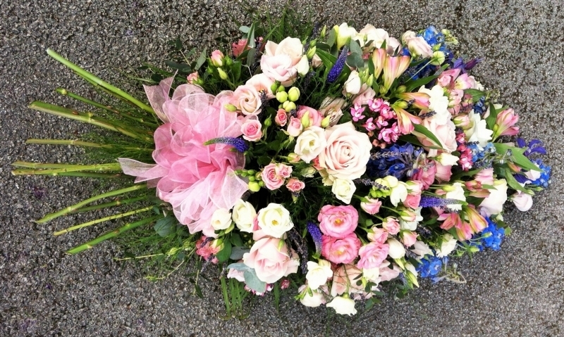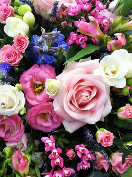 Pink, White and Blue Single Ended Spray £0.00 Options 2 foot £100.00 2.5 foot £125.00 3 foot £150.00 3.5 foot (as shown in picture) £175.00 4 foot £200.00 Add to Basket SKU: SE35 An enchanting single ended spray with stems containing premium roses, spray roses, veronica, bouvardia, alstroemeria and freesia with coordinating foliage and voile bow, measuring approximately 42 inches (105 cm) in length. Message: