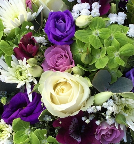 Purple and Green Posy Pad £0.00 Options 12 inch (as shown in picture) £85.00 14 inch £100.00 Add to Basket SKU: P65 A superb posy pad containing premium roses, hydrangea, anemones, spray spider chrysanthemums and gypsophila with mixed foliage, measuring 12 inches in diameter. Message: