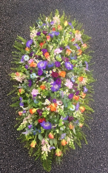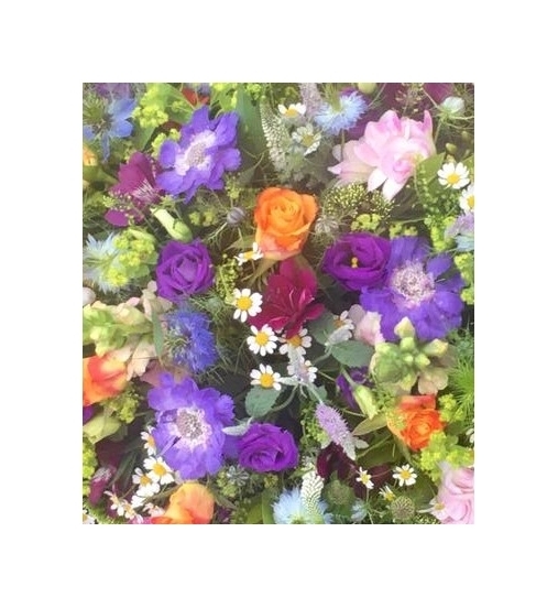 Purple and Orange Double Ended Spray £0.00 Options 3 foot £145.00 4 foot £190.00 5 foot (as shown in picture) £235.00 6 foot £285.00 Add to Basket SKU: DE15 A lovely spray contains premium roses, scabious, snapdragons, nigella, freesia, tanacetum, veronica and mint with flowing foliage measuring approximately 60 inches (150 cm) in length. Message: