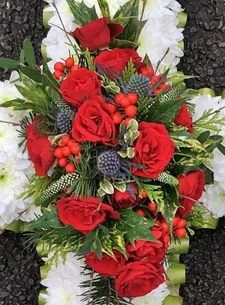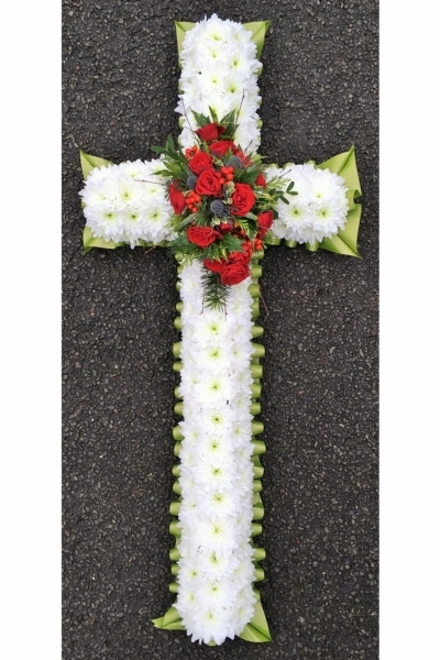 Red and Green Cross £0.00 Options 3 foot (as shown in picture) £90.00 4 foot £120.00 Add to Basket SKU: C112 This superb cross is based with white double chrysanthemums and features placements of spray roses, eryngium, hypericum and veronica with mixed foliage, measuring 36 inches (90 cm) in length. Message: