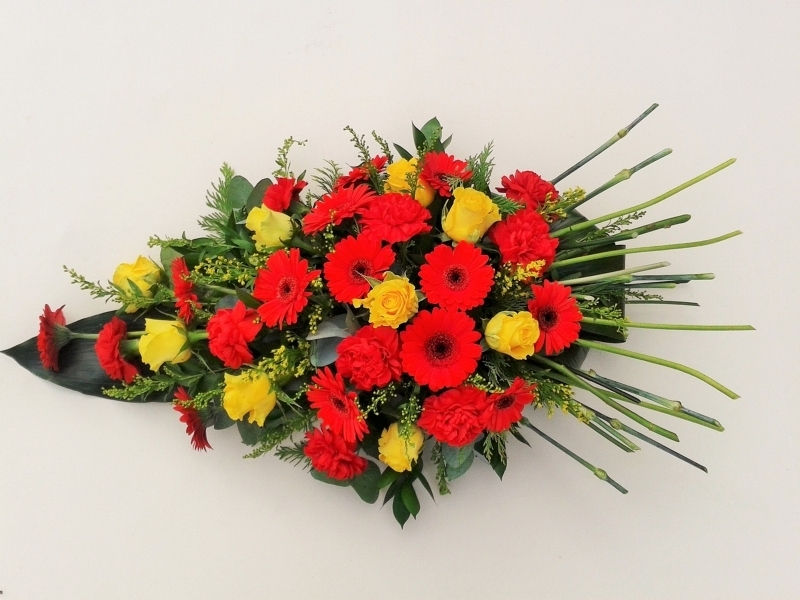 Red and Yellow Single Ended Spray £0.00 Options 2 foot (as shown in picture) £65.00 2.5 foot £85.00 3 foot £100.00 3.5 foot £115.00 4 foot £130.00 Add to Basket SKU: SE36 This stunning single ended spray with stems contains premium roses, gerbera, carnations and solidago with coordinating foliage, measuring approximately 24 inches (60 cm) in length. Message: