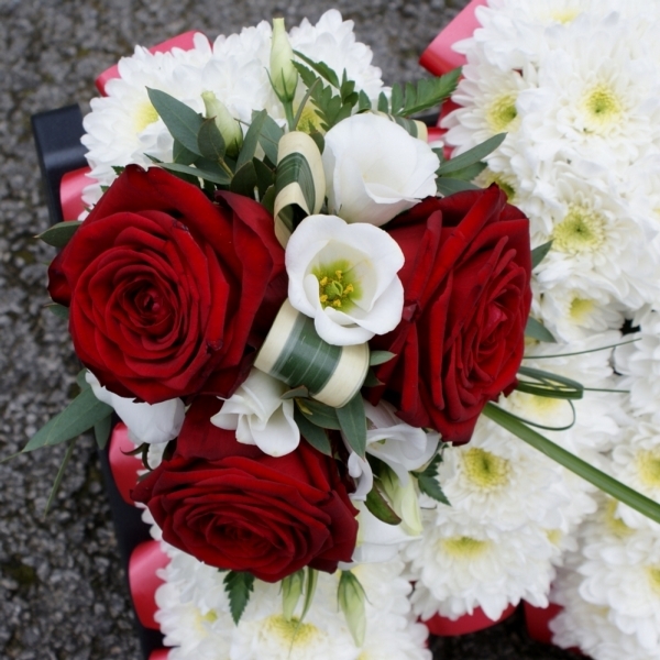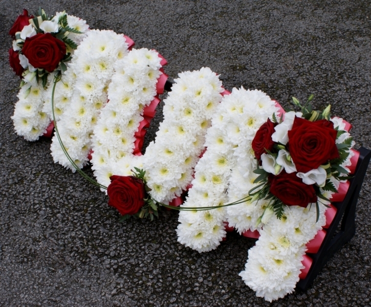 Red Based MUM £150.00 Add to Basket SKU: L10 Individual tributes can be created using your choice of letters, this is based using white double chrysanthemums, edged with red ribbon and highlighted with beautiful red and white sprays using quality roses and lisianthus with variegated foliage. Message: