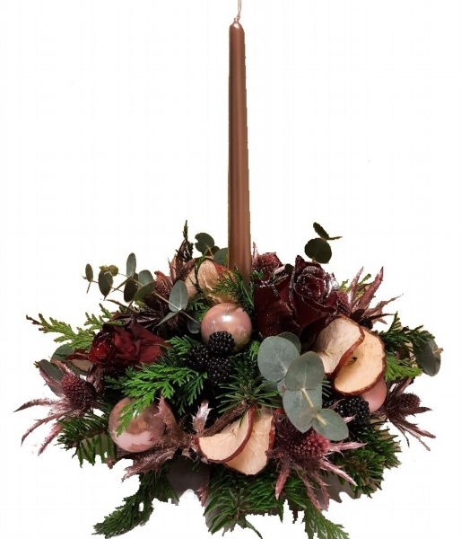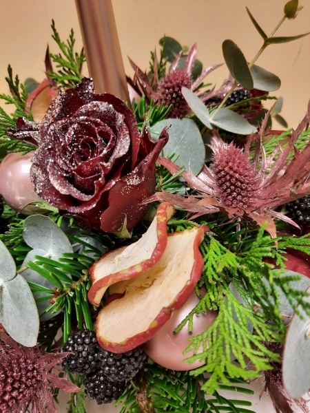 A beautiful circular table centre containing stunning premium glitter red roses, rose gold sparkle eryngium thistle, red apple slices, pink baubles & faux groups of blackberries with mixed winter foliage and eucalyptus enhanced with a red gold candle in the centre.