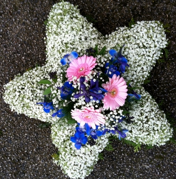 Star £95.00 Add to Basket SKU: ID01 This delightful star contains germini, delphinium and gypsophila with coordinating foliage, measuring approximately 15 inches (37 cm) in diameter. Message: