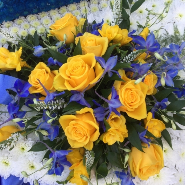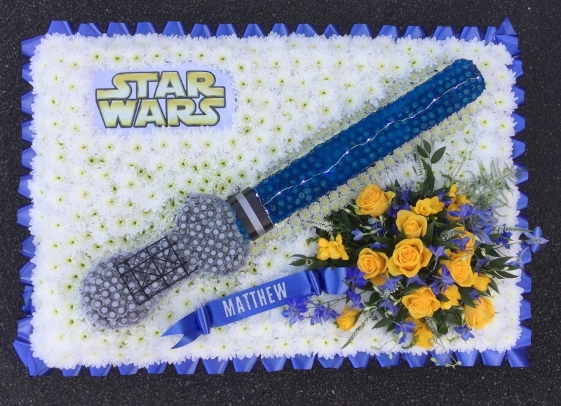 A truly memorable tribute contains basing chrysanthemums with a large spray of yellow roses, delphinium, veronica & freesia, and features a lightsaber of tiny stallion chrysanthemums enhanced with twinkling fairy lights, measuring in total approximately 36 inches (90 cm) in width.