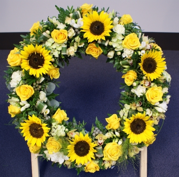 Sunflower Wreath £165.00 Add to Basket SKU: W07 A spectacular wreath containing sunflowers, quality roses, hydrangea, cymbidium orchids, spray roses and freesia with coordinating foliage, measuring approximately 24 inches (60 cm) in diameter. Message: